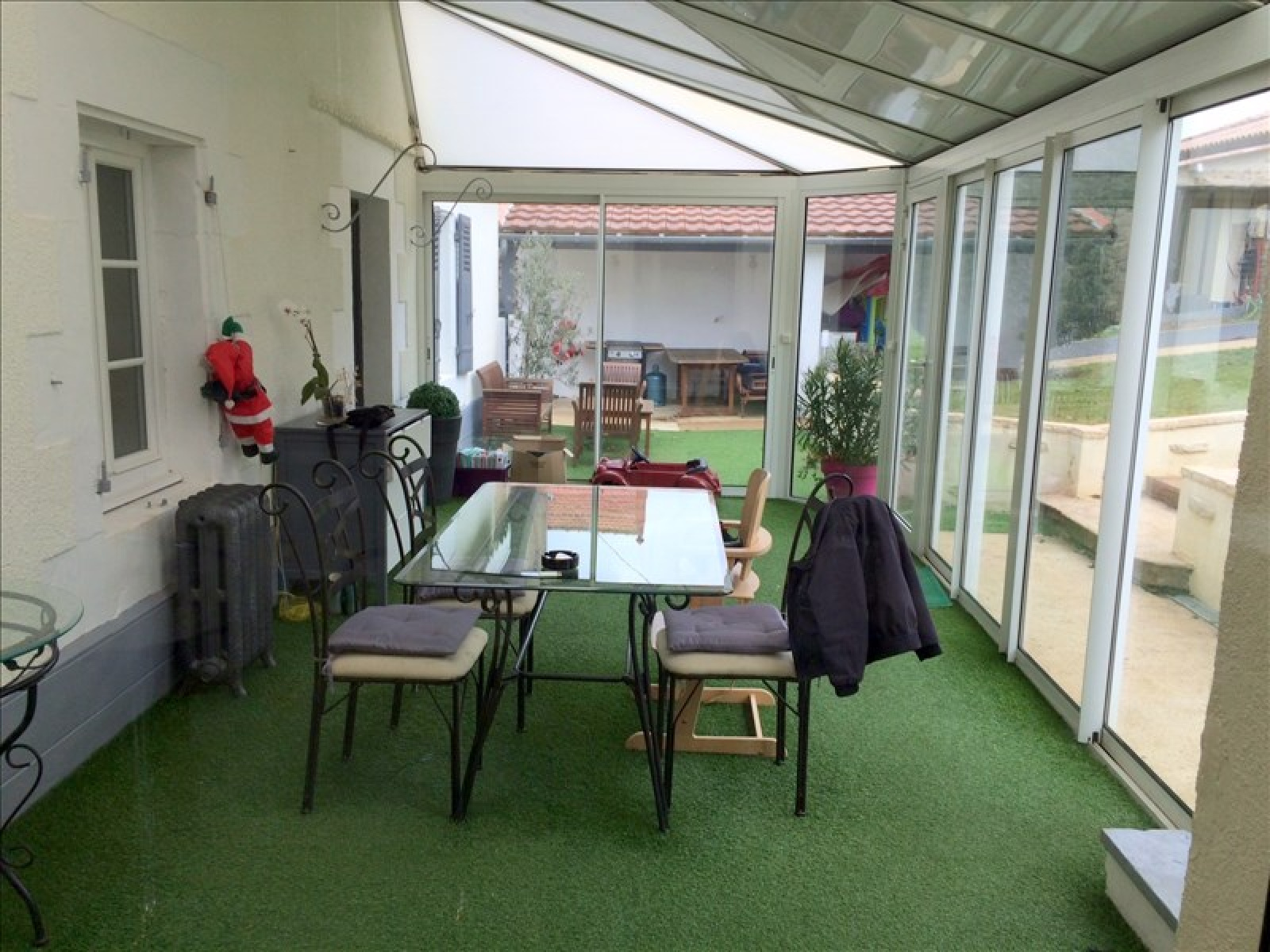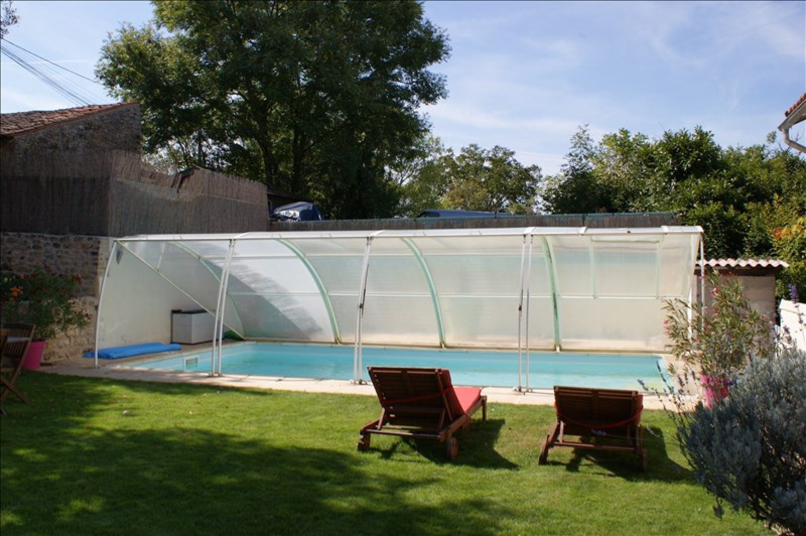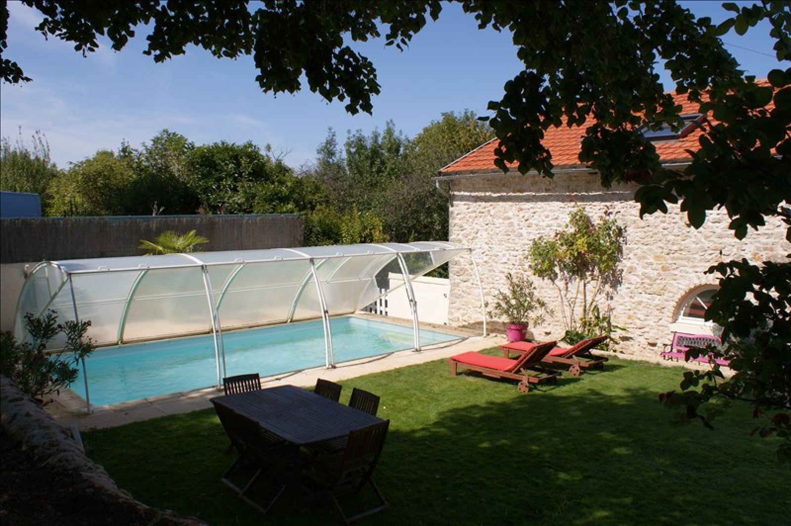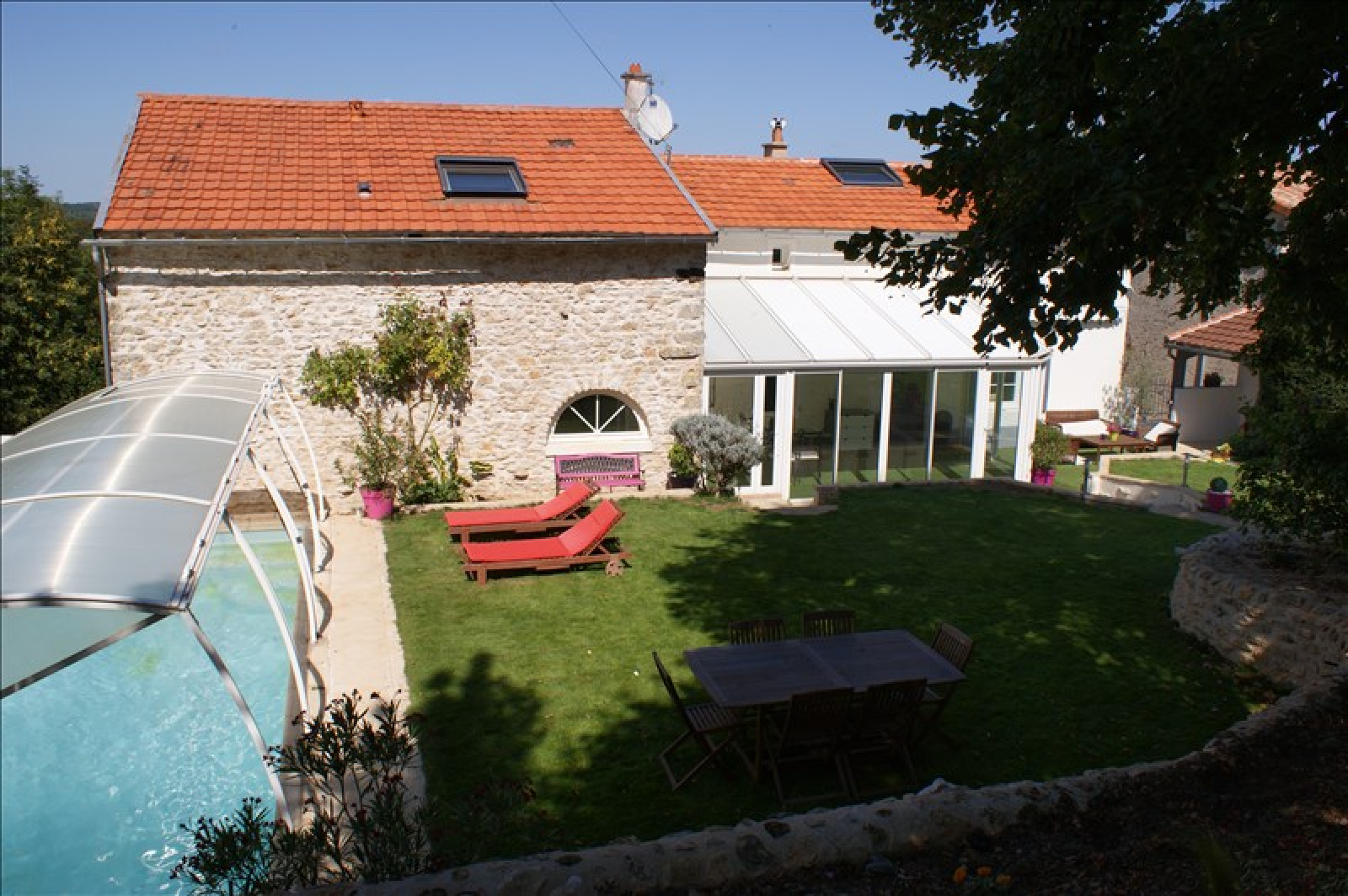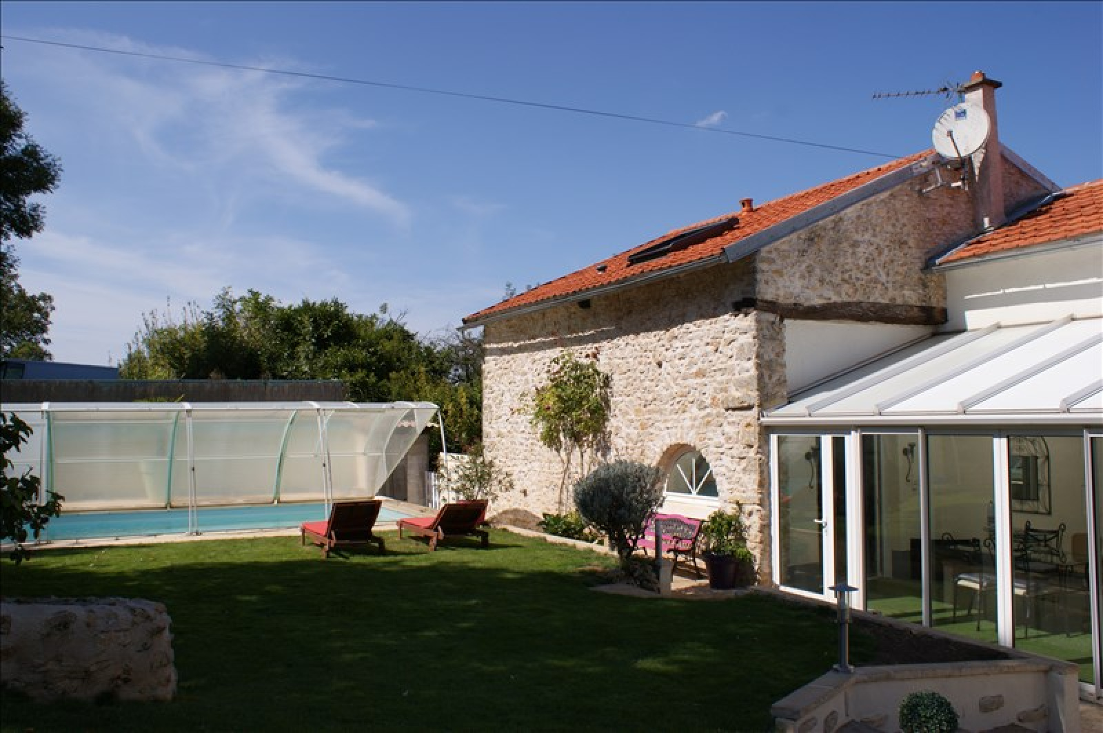 ASLONNES ~~AU CALME DANS VILLAGE~~Très jolie maison ancienne rénovée avec piscine,comprenant : ~~beau salon sur parquet ancien avec cheminée insert, une salle à manger dans la véranda, une cuisine aménagée et équipée de l'électroménager, ~~Au rez de chaussée une chambre parentale avec salle de bains et dressing. ~~A l'étage 3 belles chambres avec salle d'eau et WC. ~~Buanderie, cave et garage indépendant sur un terrain d'environ 900 m²~~Piscine avec sky-dôme (très économique pour chauffer l'eau de la piscine)~~Double vitrage, isolation récente, pierres et poutres apparentes...~Chauffage central~~PRIX : 241 500 EUR HAI dont 5 % de HA à la charge de l'acquéreur